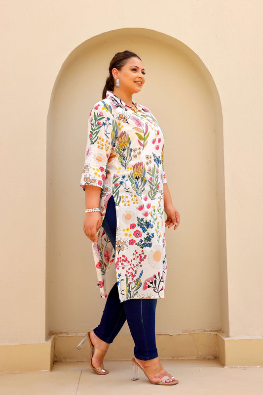 White Botanical Garden Plus Size Kurti – Elegant & Vibrant Bloom