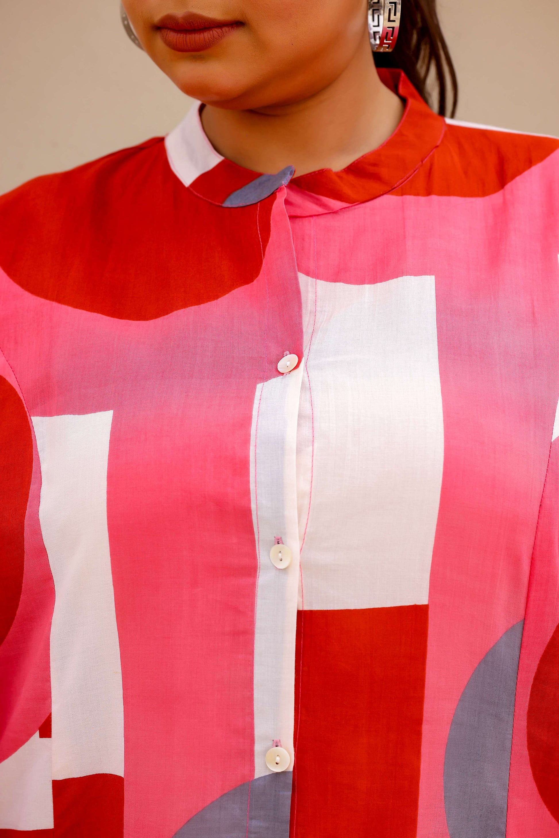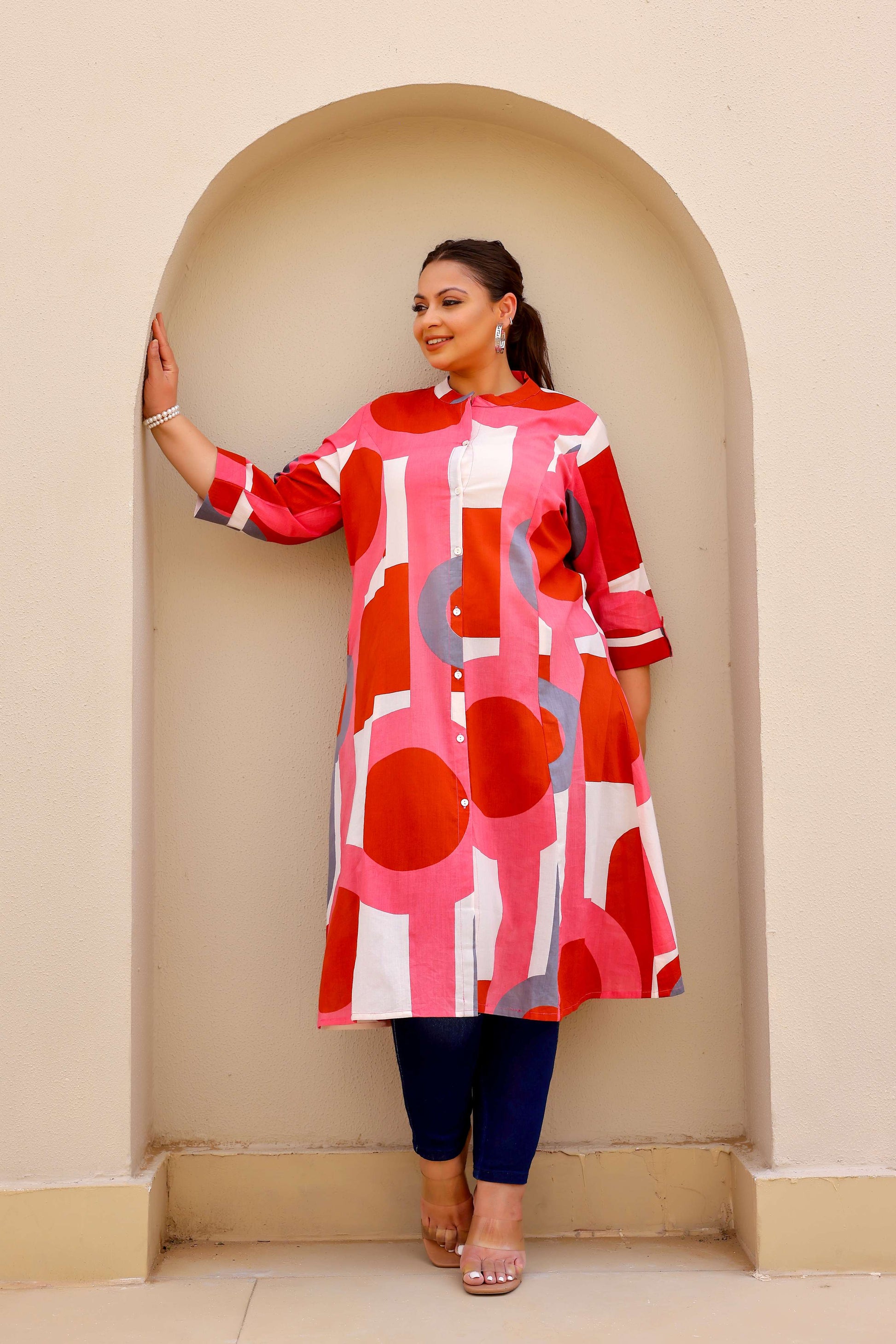 Bold Geometric Print Cotton Kurti in Red & Pink Tones