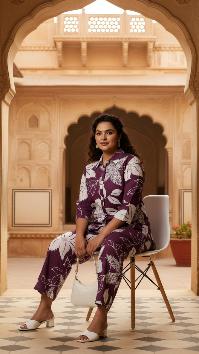 Comfort Fit Plum Colour Block Print Co-ord Set