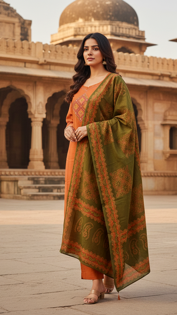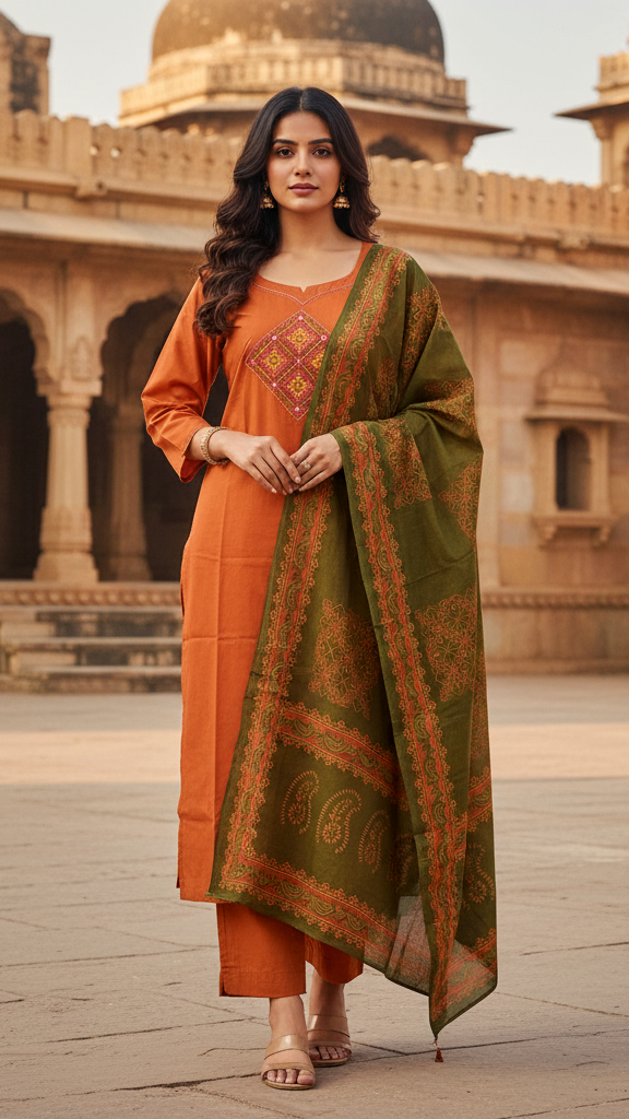Chic Burnt Orange & Olive Green Kurta Set with Diamond Embroidered Yoke and Block Print Dupatta