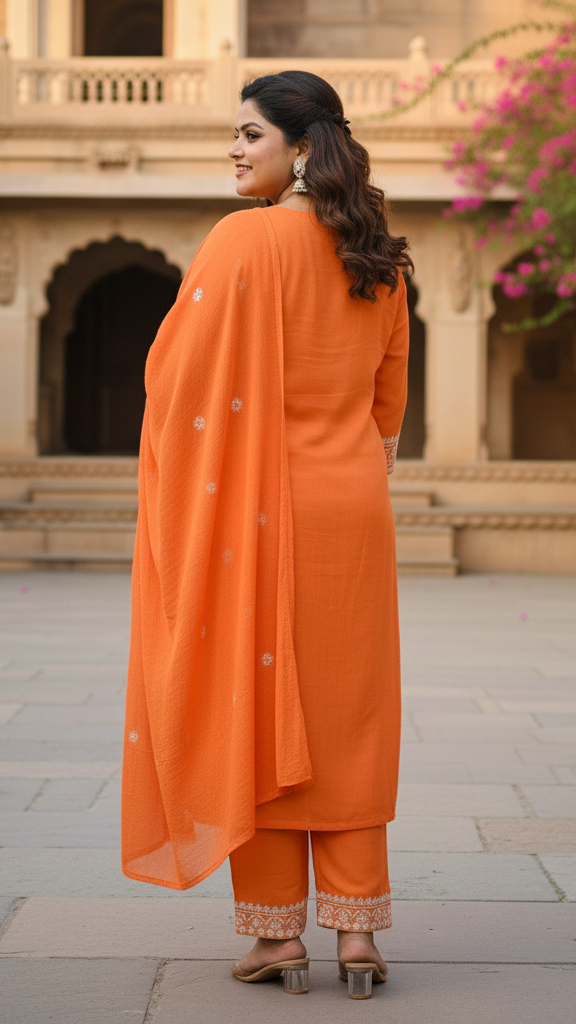 Zesty Orange Cotton Kurta Set with Intricate White Thread Work Embroidery