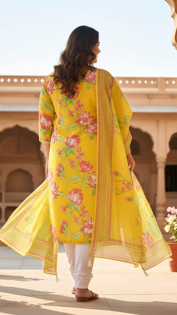 • Complete Set: Includes a straight-cut kurta, comfortable bottoms (e.g., trousers/palazzos), and a matching dupatta.