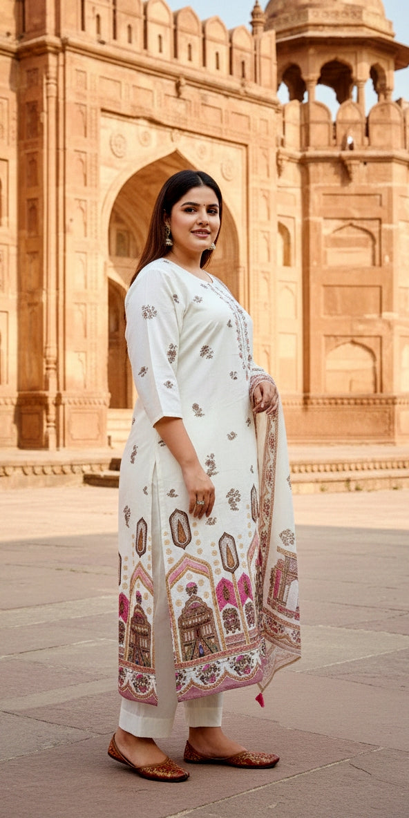 Elevate your ethnic wardrobe with this stunning Ivory Heritage Print Kurta Set, inspired by timeless architectural motifs and traditional artistry. Designed for grace and comfort, this outfit is perfect for festive occasions, family gatherings, and elegant day events.