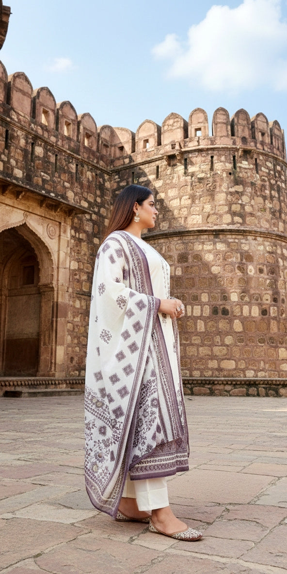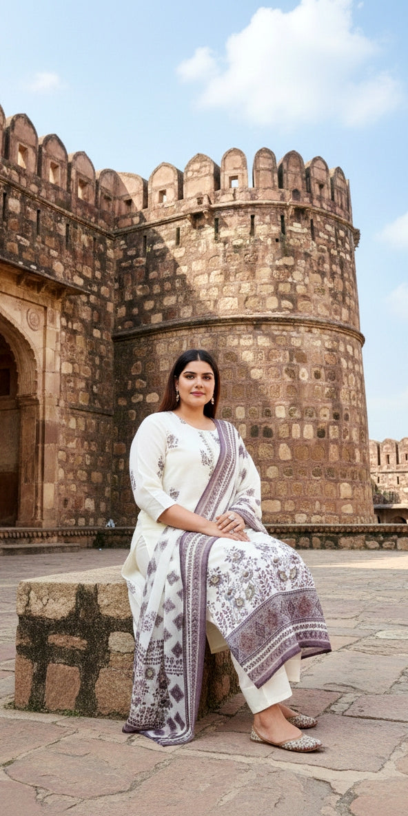 Ivory Floral Printed Kurta Set with Dupatta | Elegant Ethnic Wear for Women