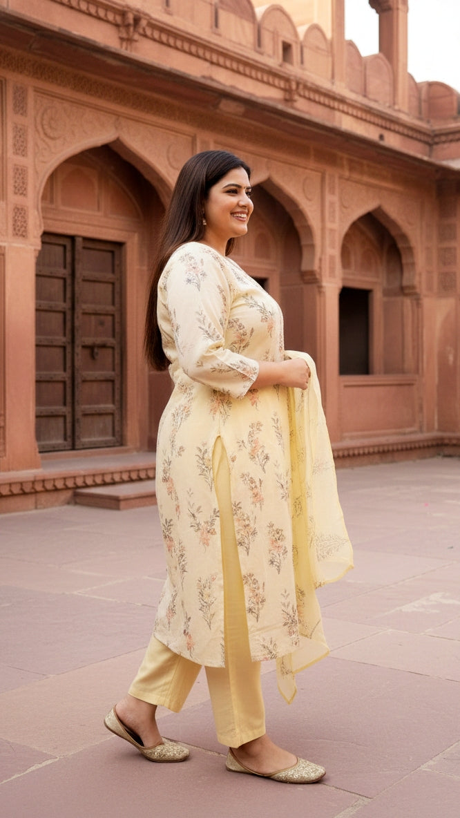 Women’s Pastel Yellow Floral Printed Kurta Pant Set with Dupatta | Elegant Festive Ethnic Suit Set