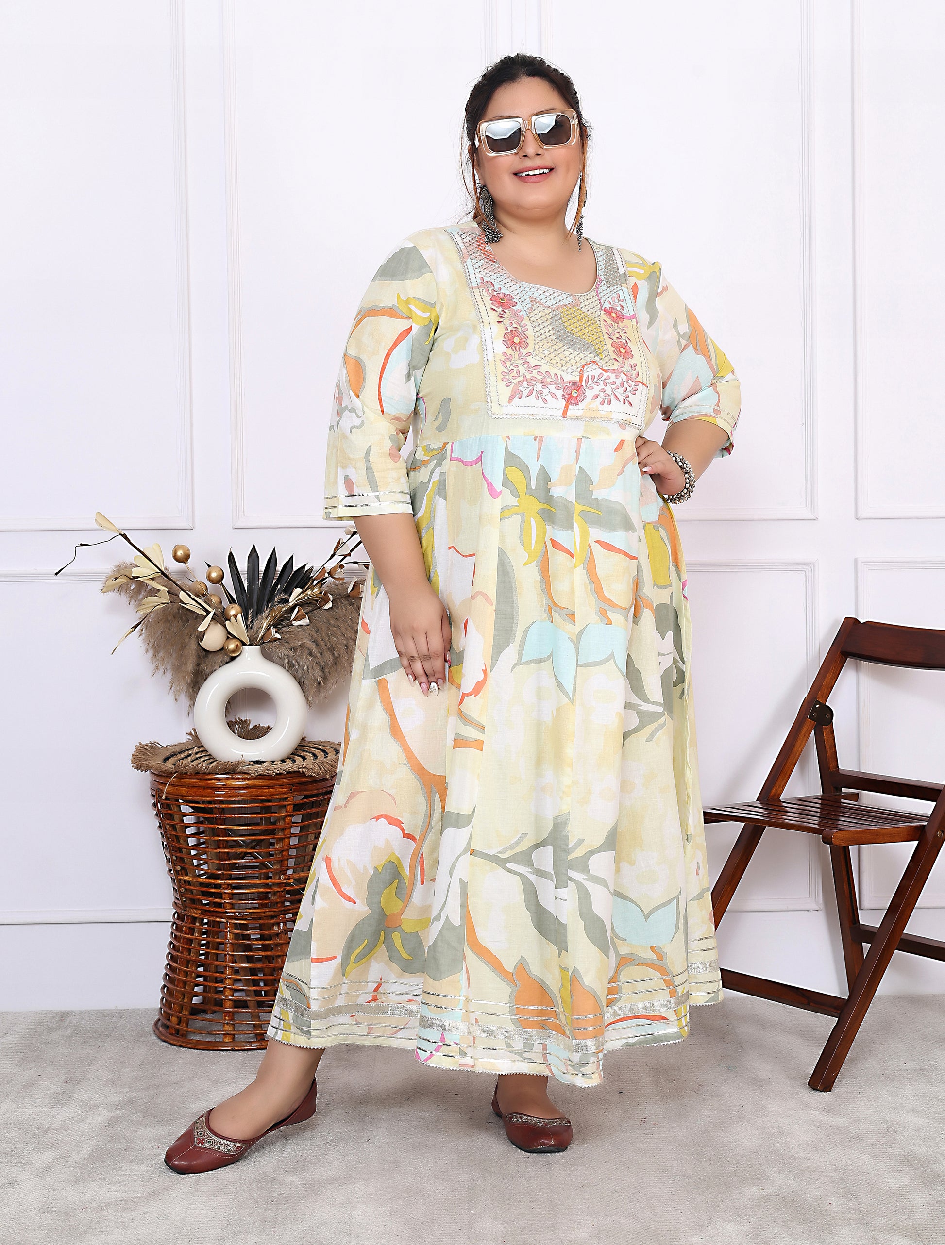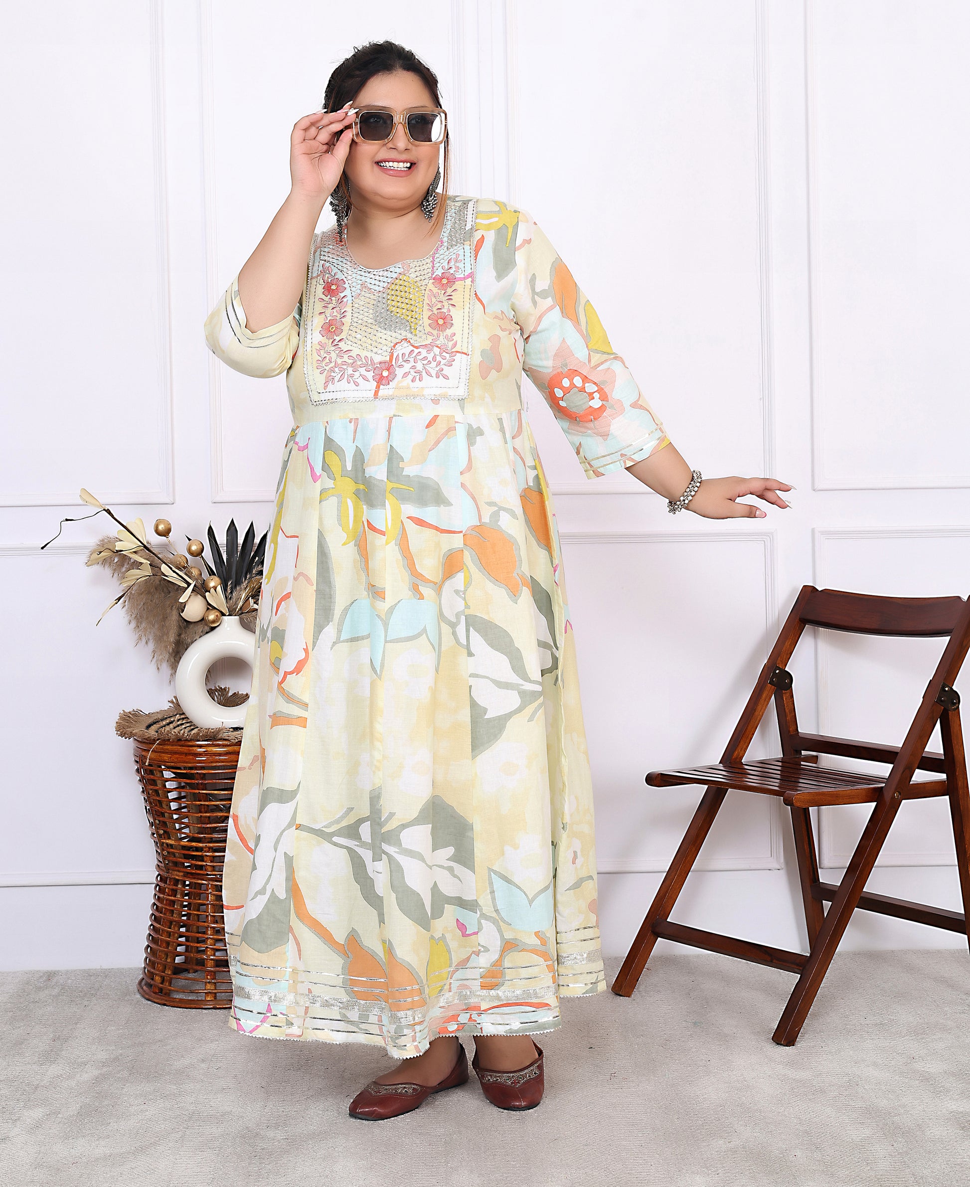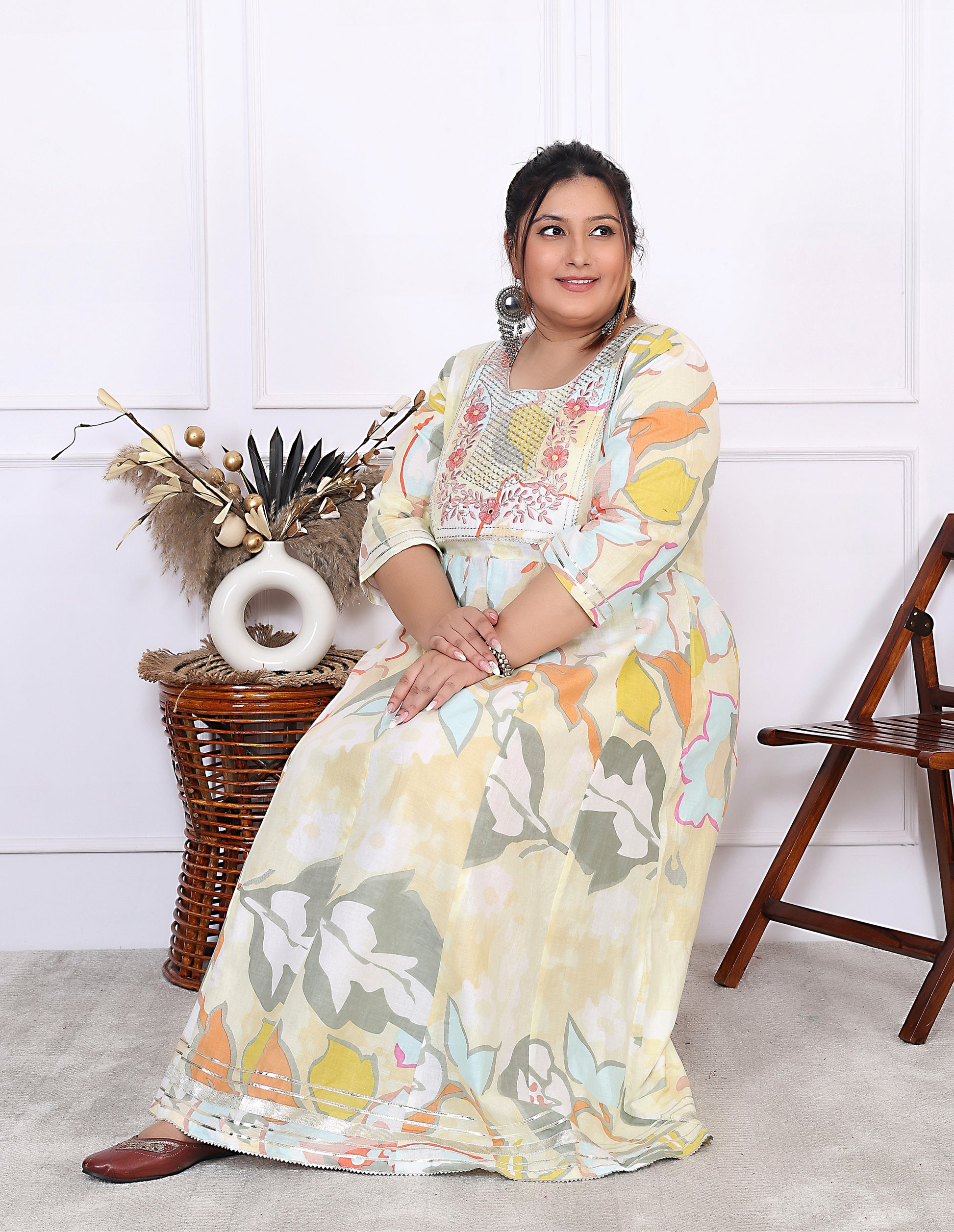Plus Size Yellow Cotton Floral Print Embroidered Gown (B24-Yellow)