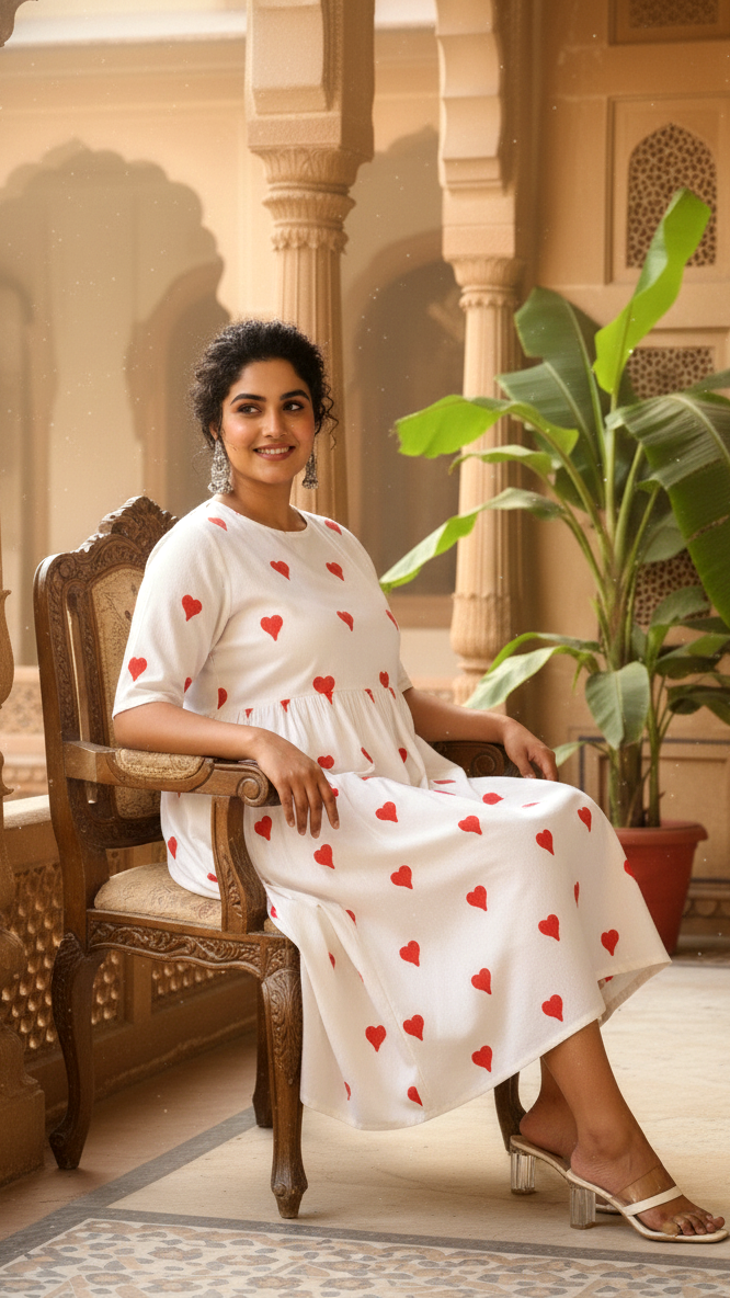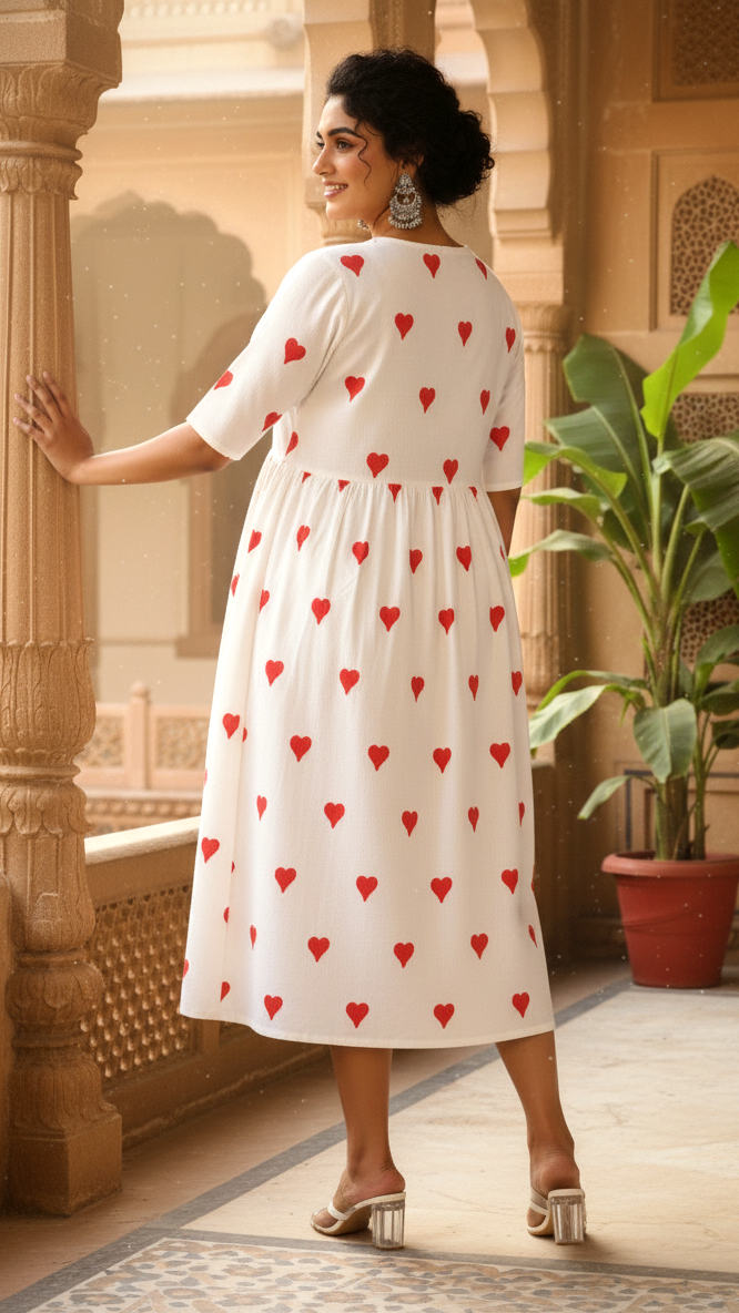 Plus Size White Red Hearts Print Gathers Cotton Dress