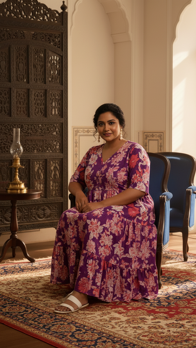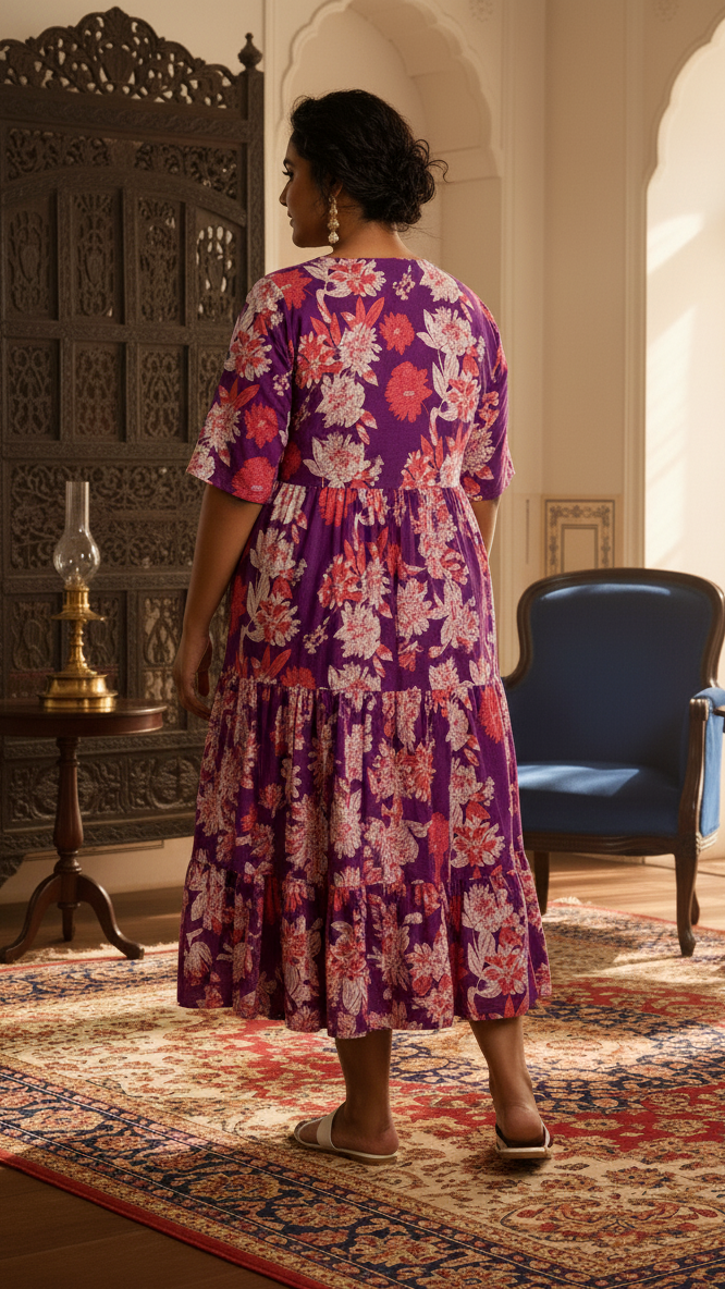 Plus Size Purple & Coral Large Floral Print Tiered Midi Dress