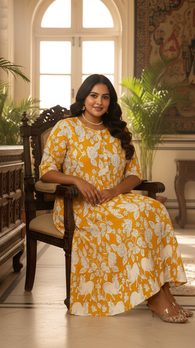 Mustard Yellow Animal Motif Plus Size Long Tunic Dress