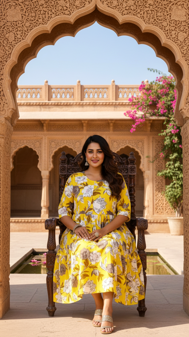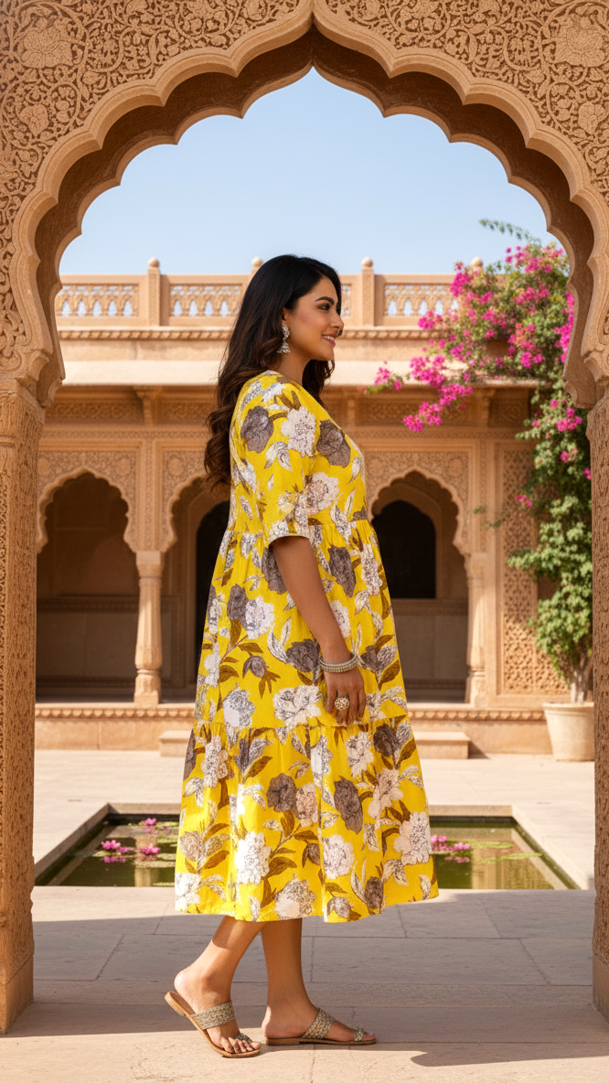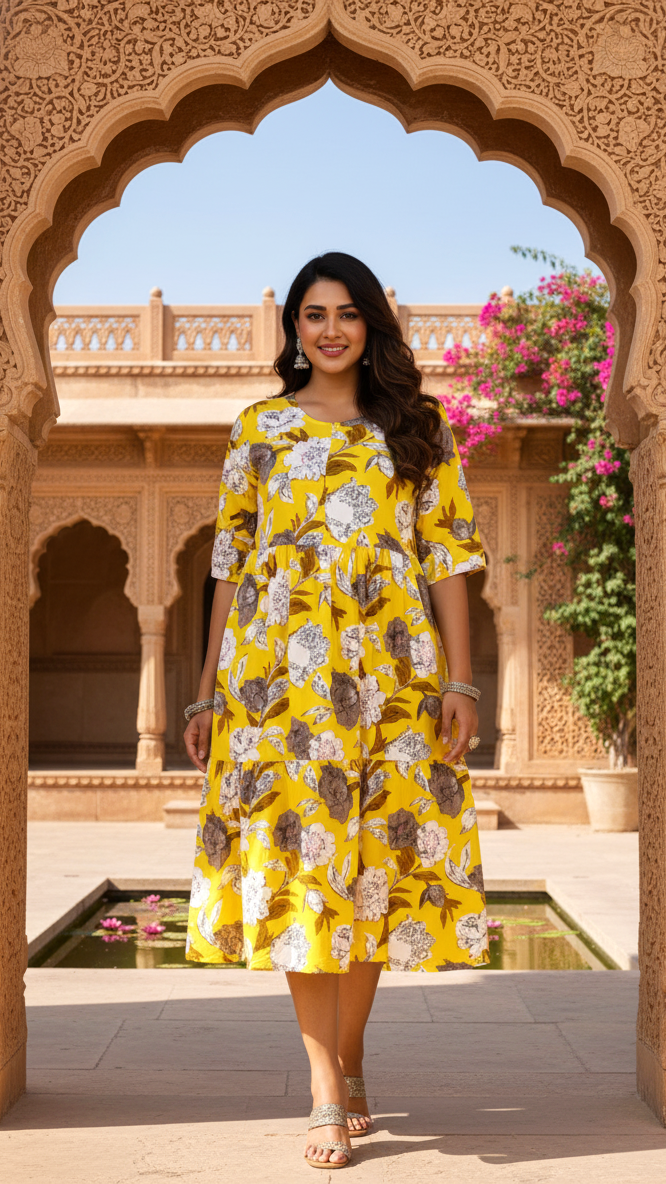 Plus Size Sunny Yellow Floral Gathers Cotton Dress