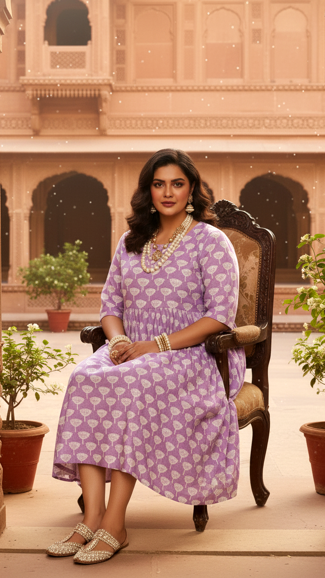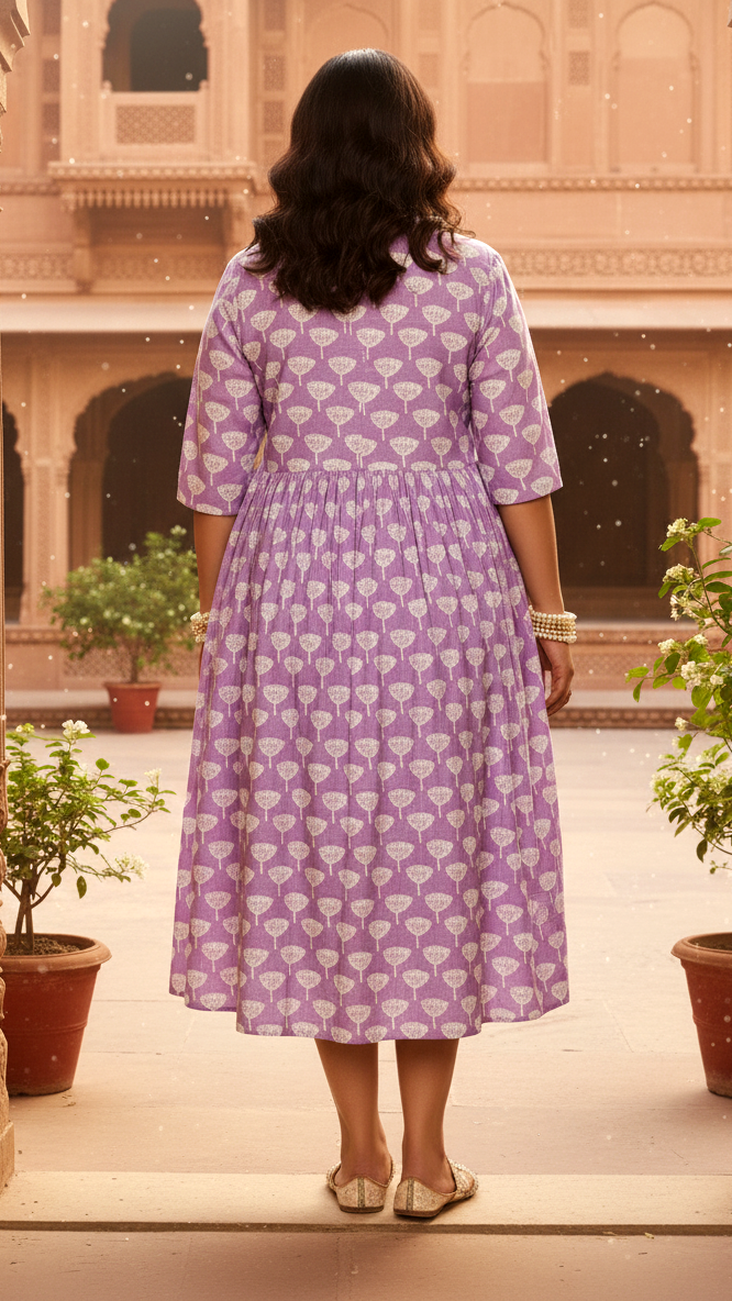 Lavender Tree Motif Plus Size V-Neck Cotton Dress