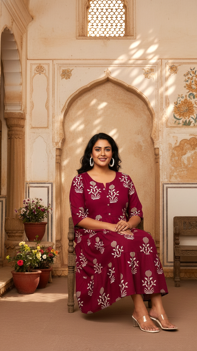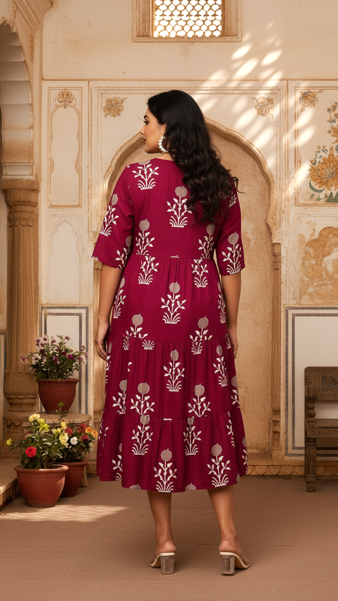 Deep Maroon Floral Print Plus Size Tiered Tunic Dress