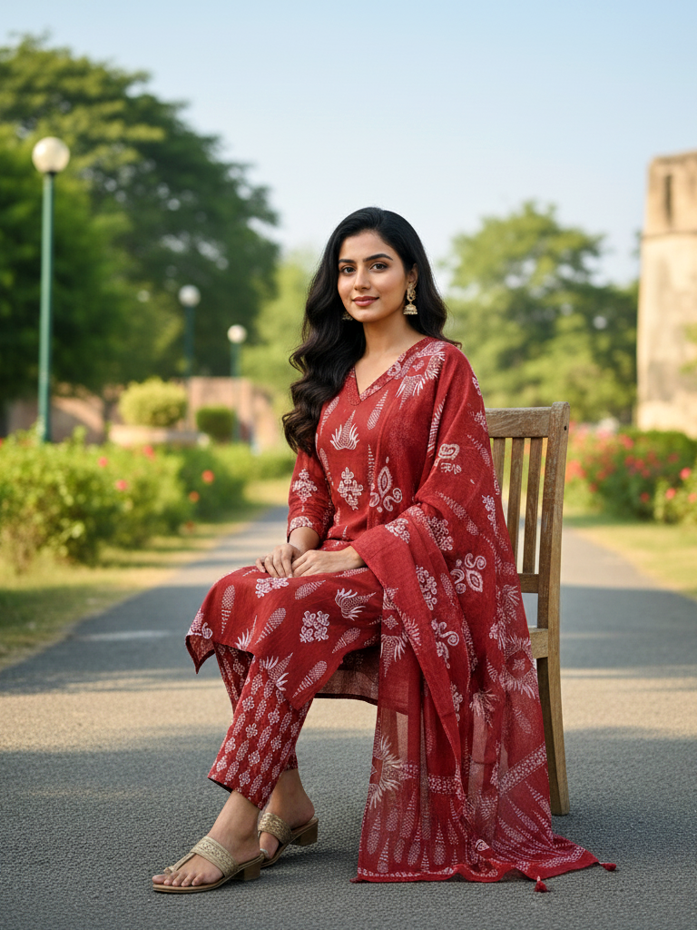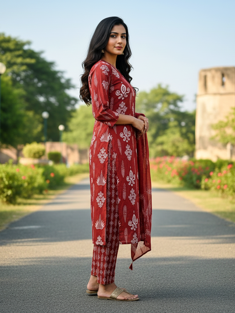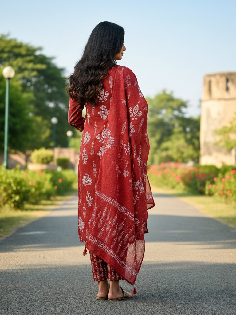 Rich Maroon Red Block Print Cotton Suit Set with All-Over Motif Print and Matching Dupatta