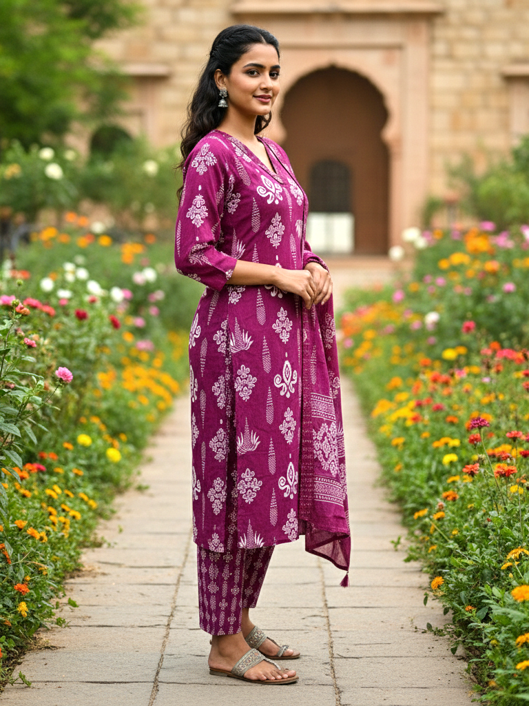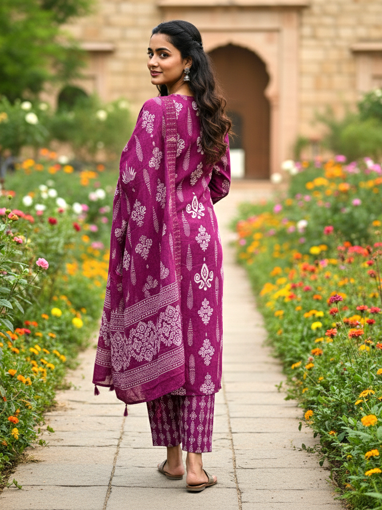 Vibrant Fuchsia Pink Block Print Kurta Set with Traditional Motif Pattern and Dupatta