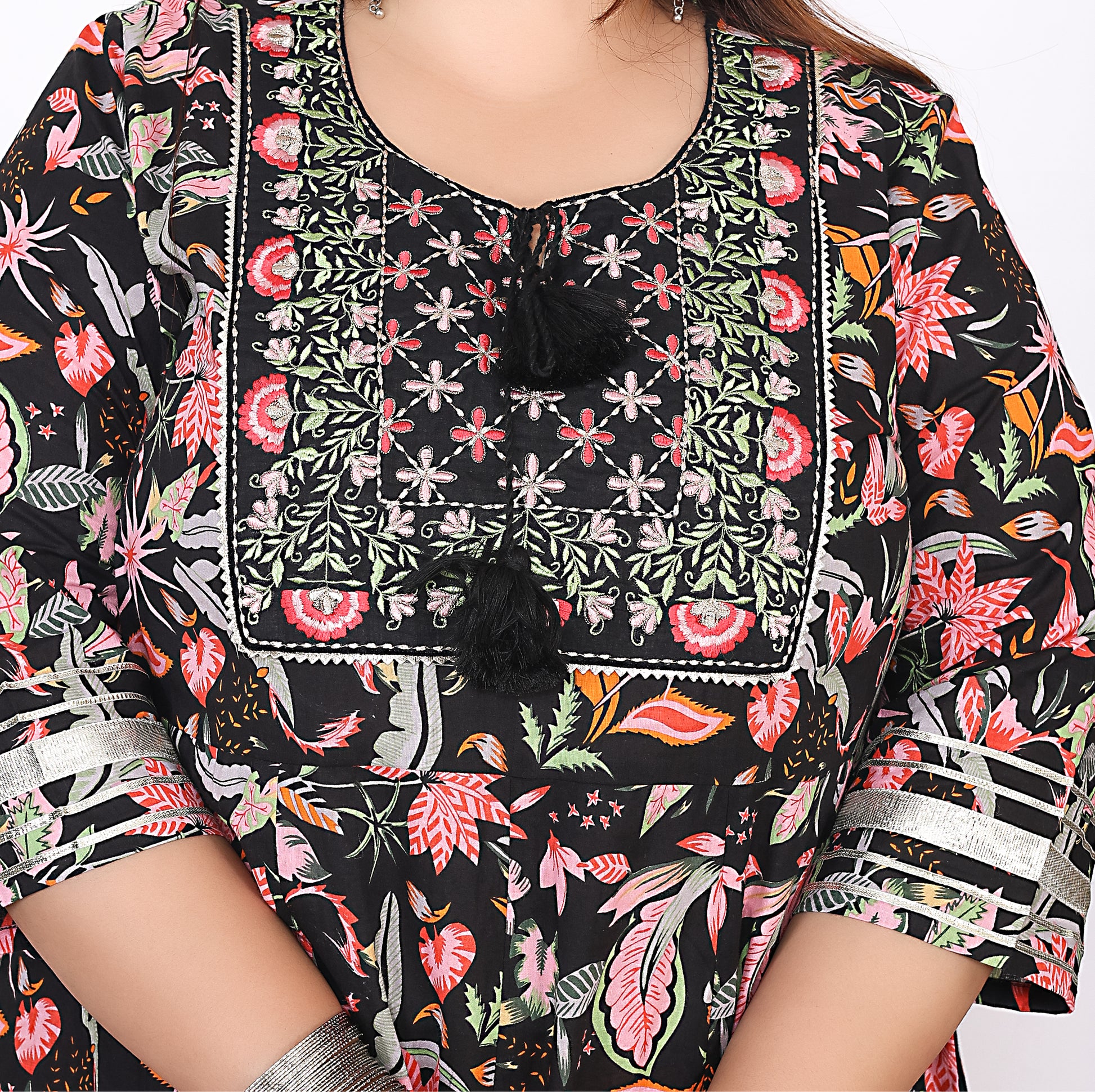 Plus Size Black Cotton Floral Print Embroidered Gown (B23-Black)