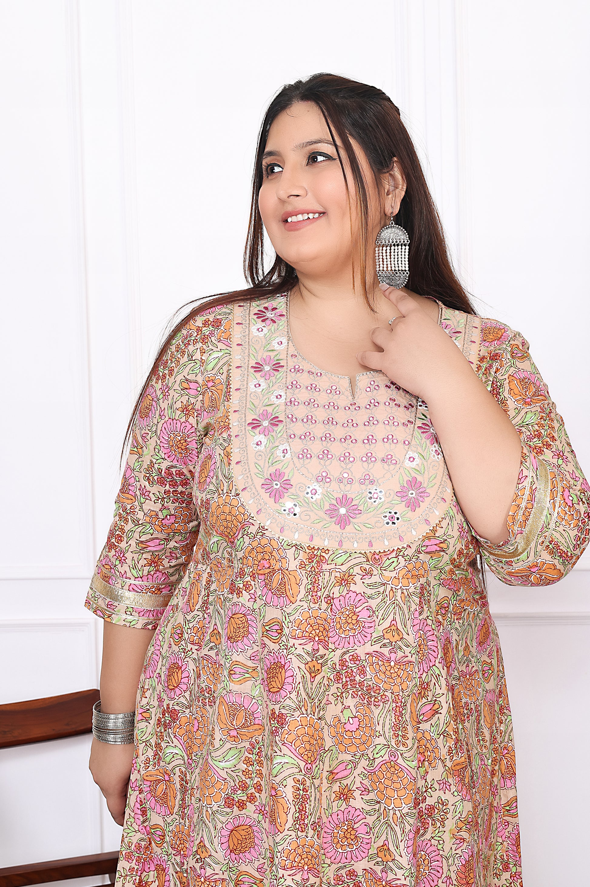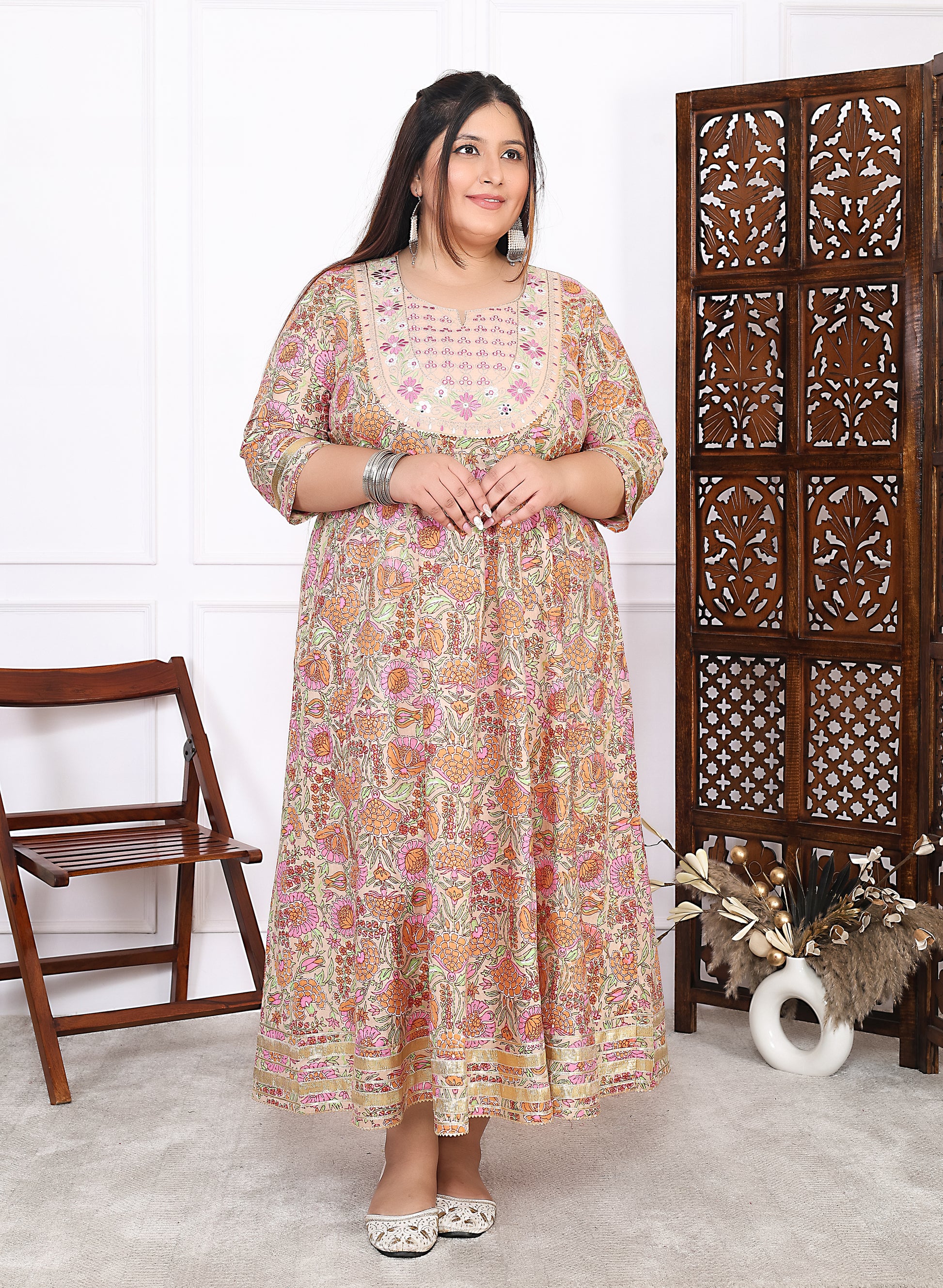 Plus Size Peach Cotton Floral Print Embroidered Long Kurta (B22-Peach)
