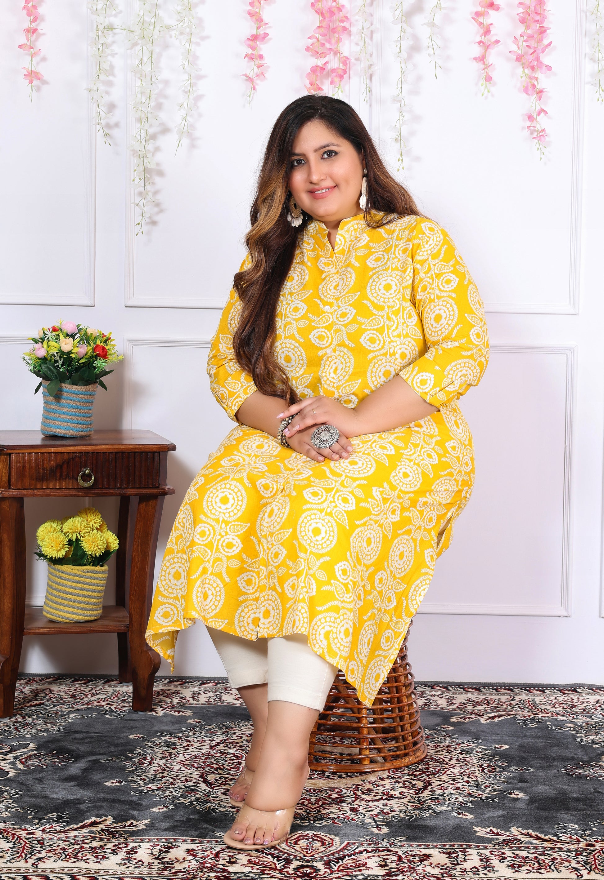 Women Printed Cotton A-line Kurta (B06-Yellow)