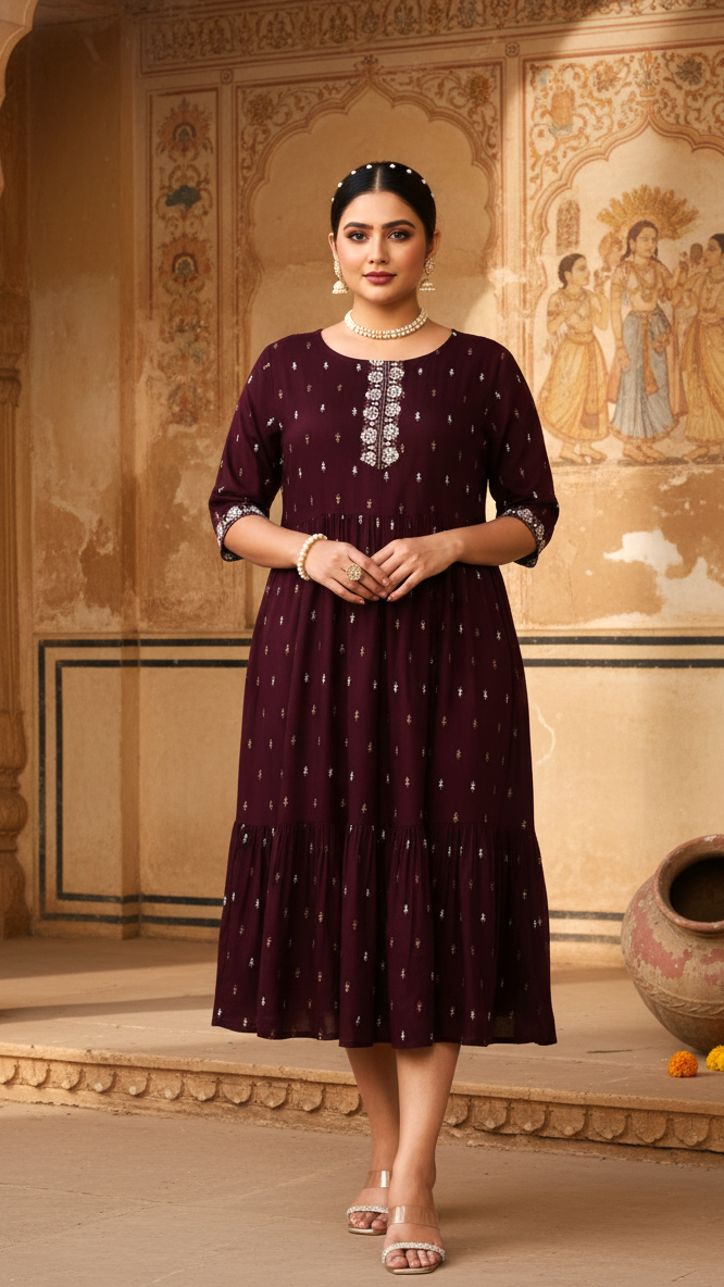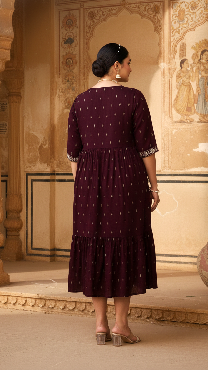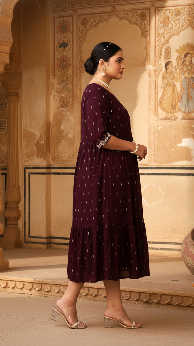 Deep Plum Embroidered Yoke Plus Size Tiered Dress