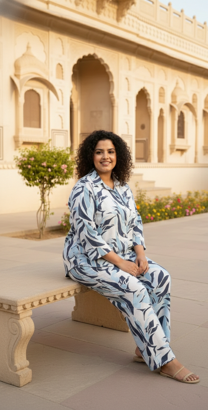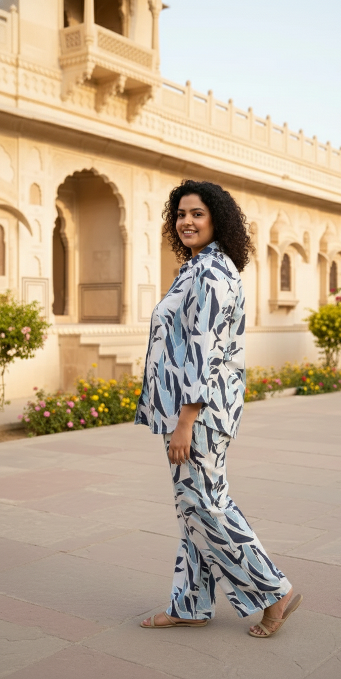 Blue & White Leaf Print Cotton Co-Ord Set for Women | Relaxed Fit Shirt & Pant Set
