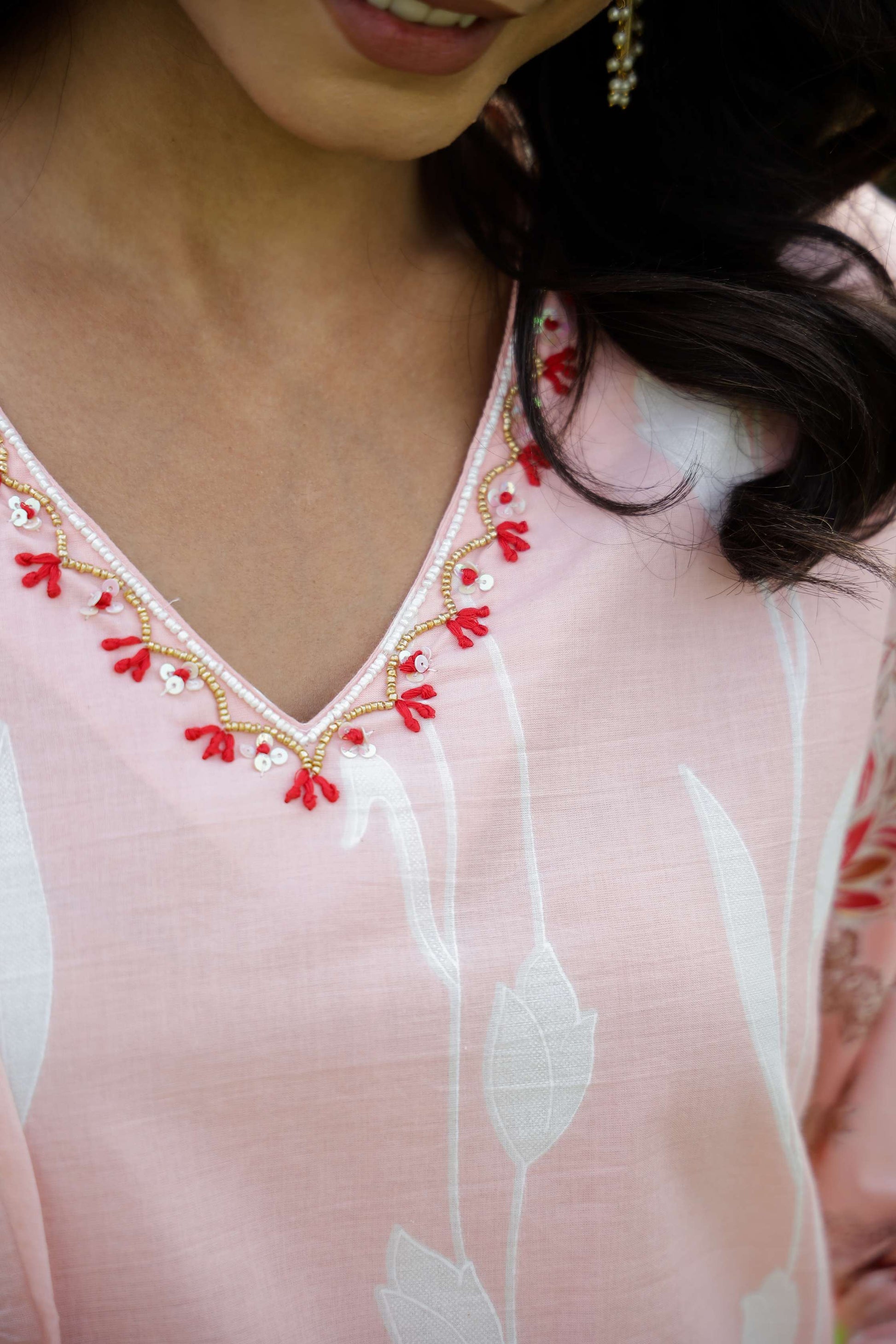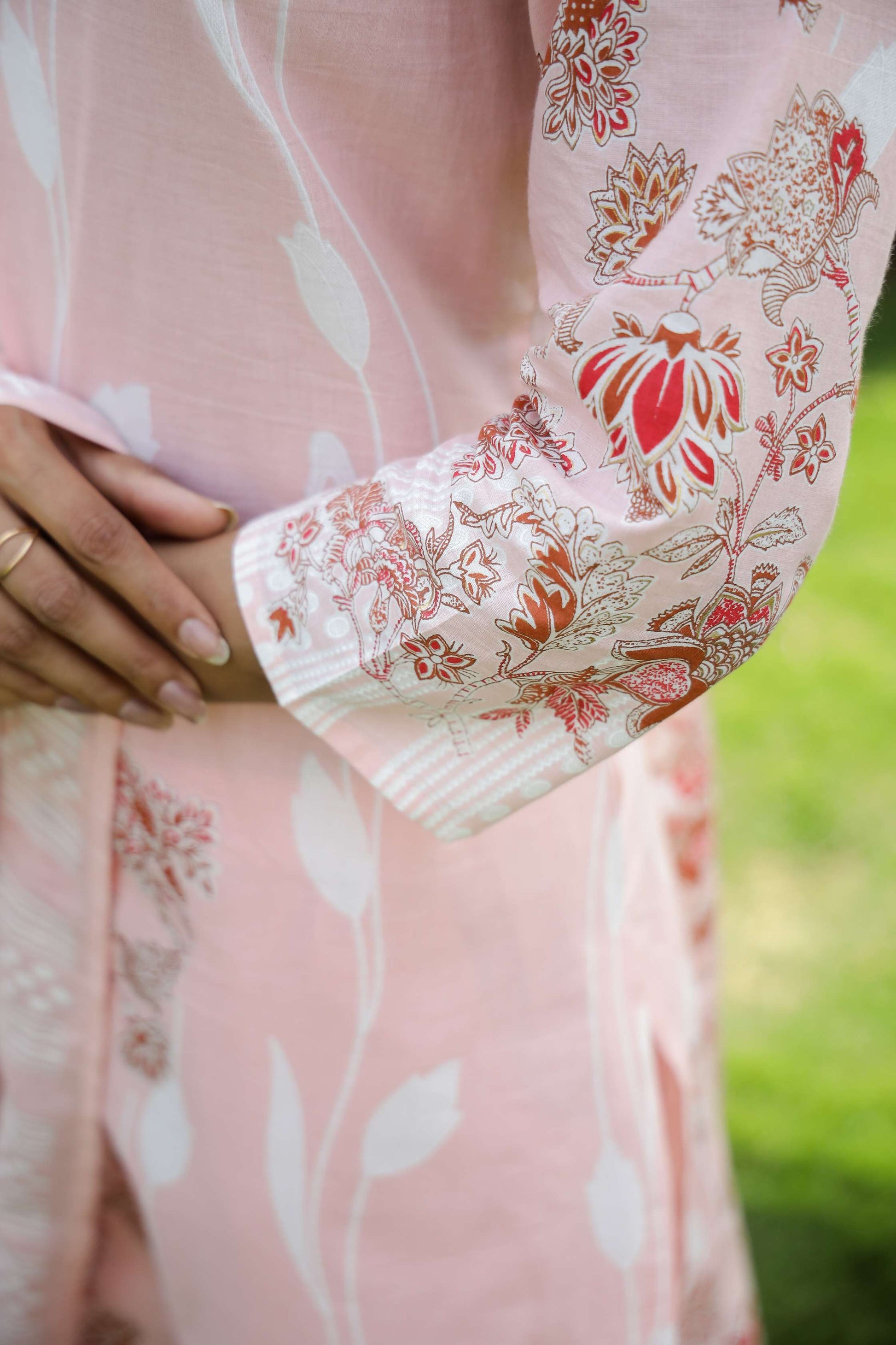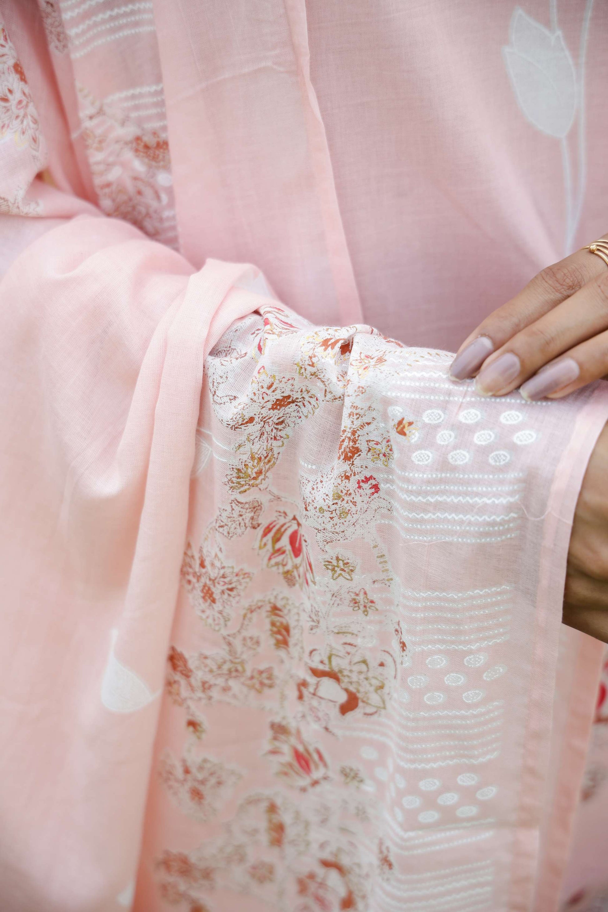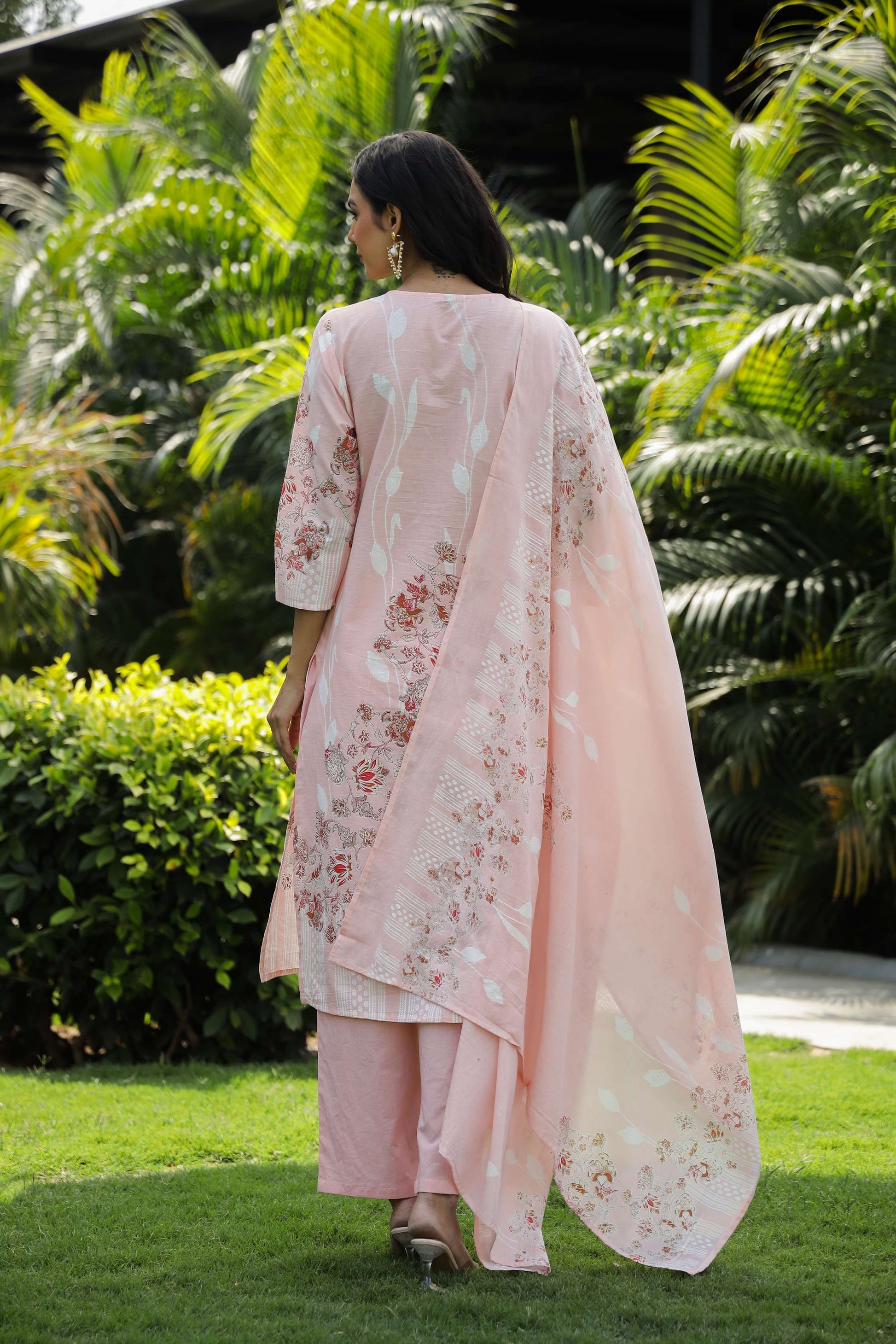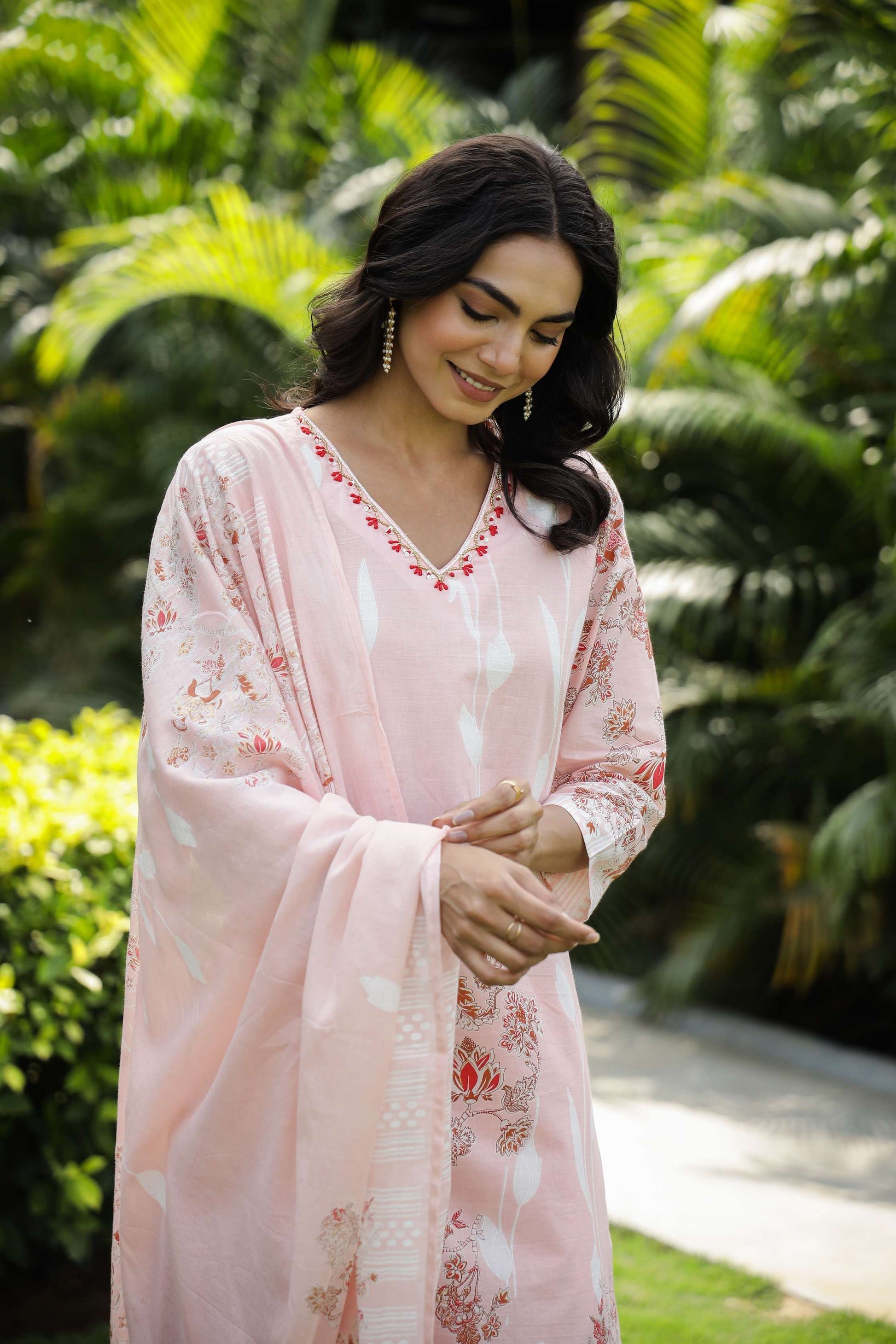 Pastel Pink Floral Print Cotton Kurta Set with Dupatta