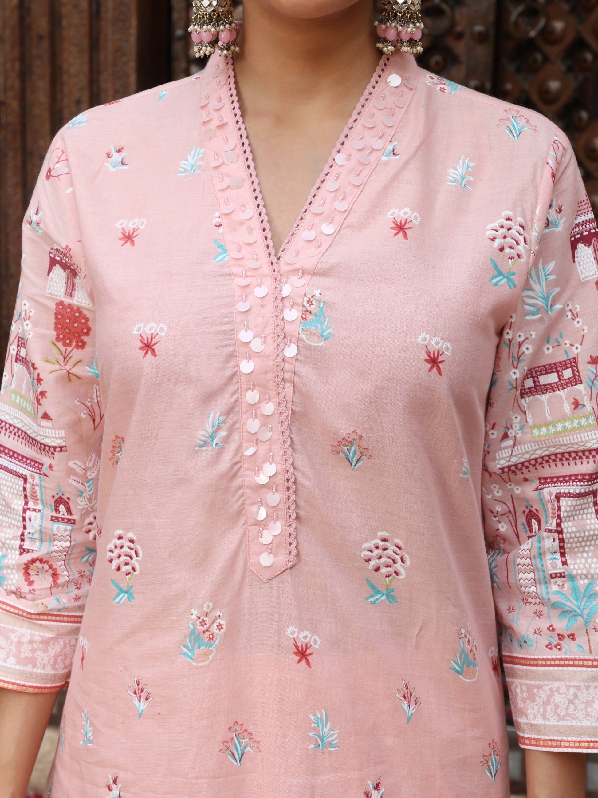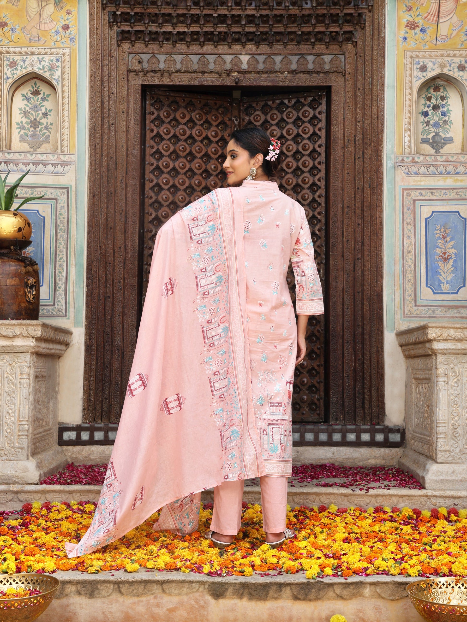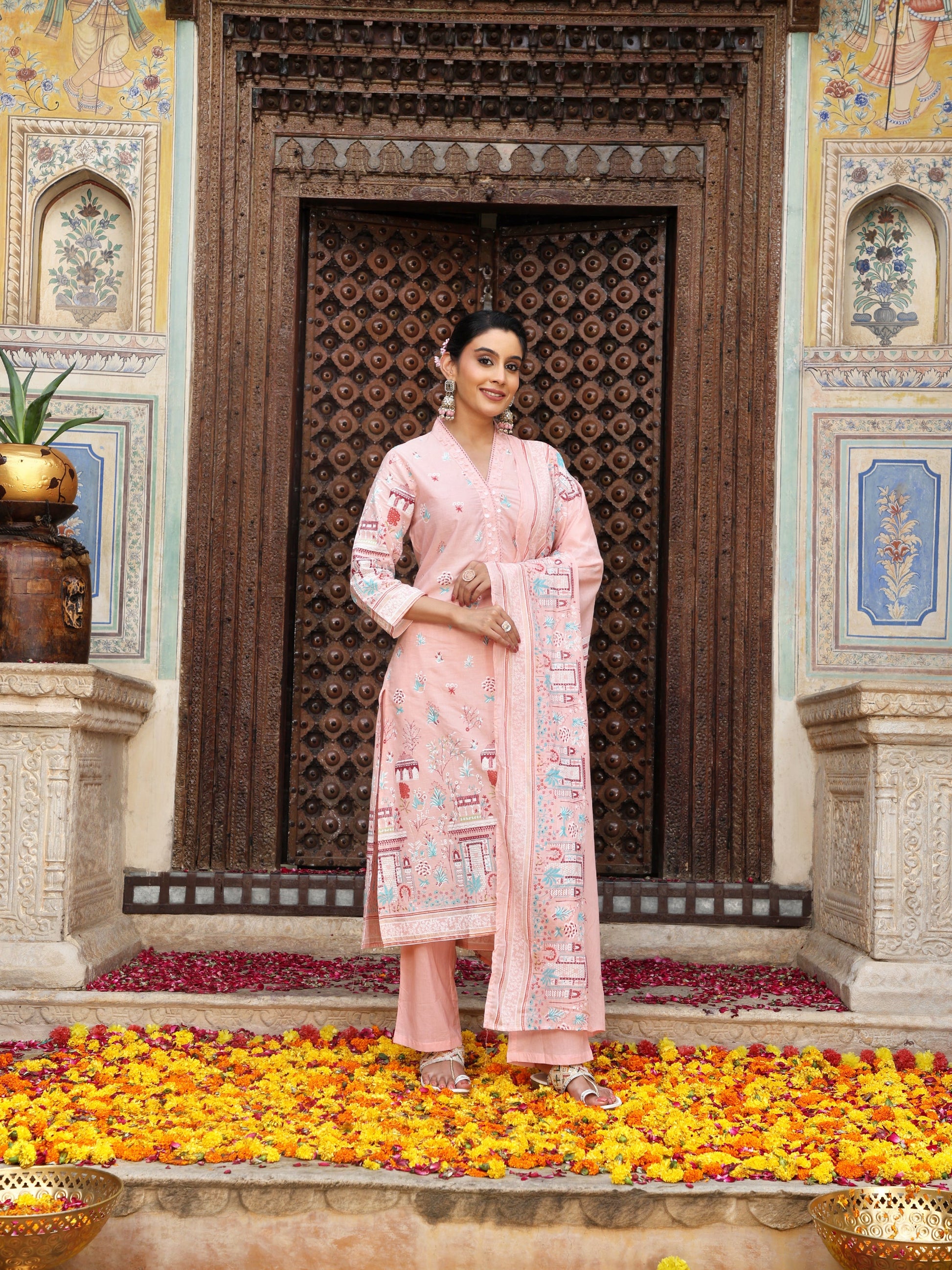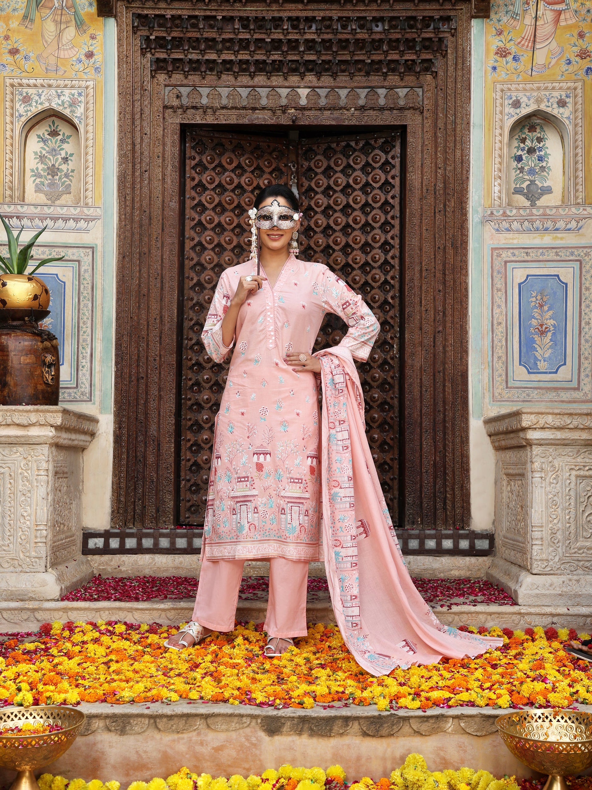 Pastel Pink Heritage Print Cotton Suit Set with Dupatta