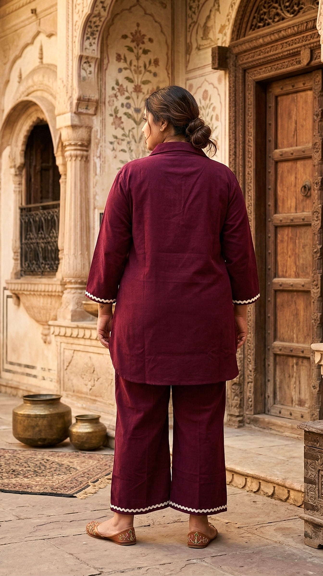 Plus Size Wine Cotton Co-ord Set with Contrast Lace Detailing | Elegant Ethnic Co-ords for Women