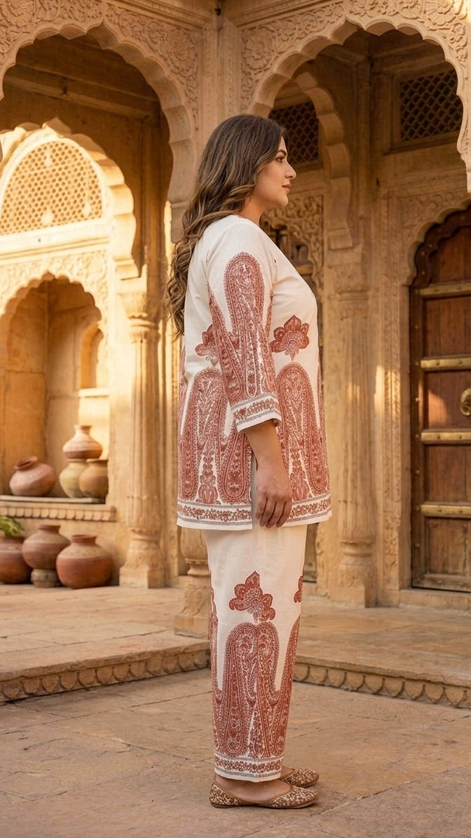 Plus Size Off-White Cotton Printed Co-ord Set with Ethnic Motif Design | Elegant Casual Co-ords for Women