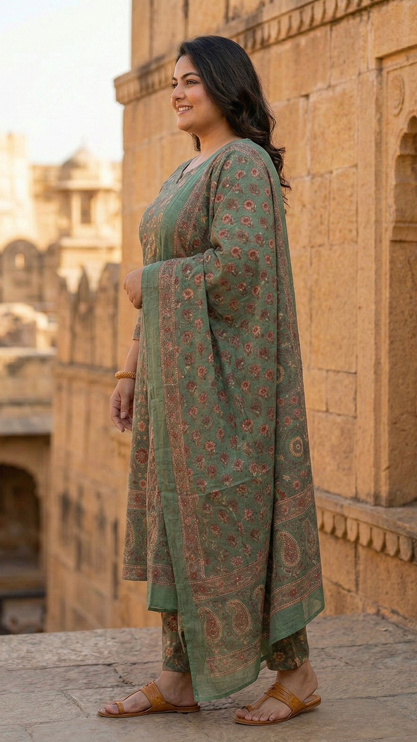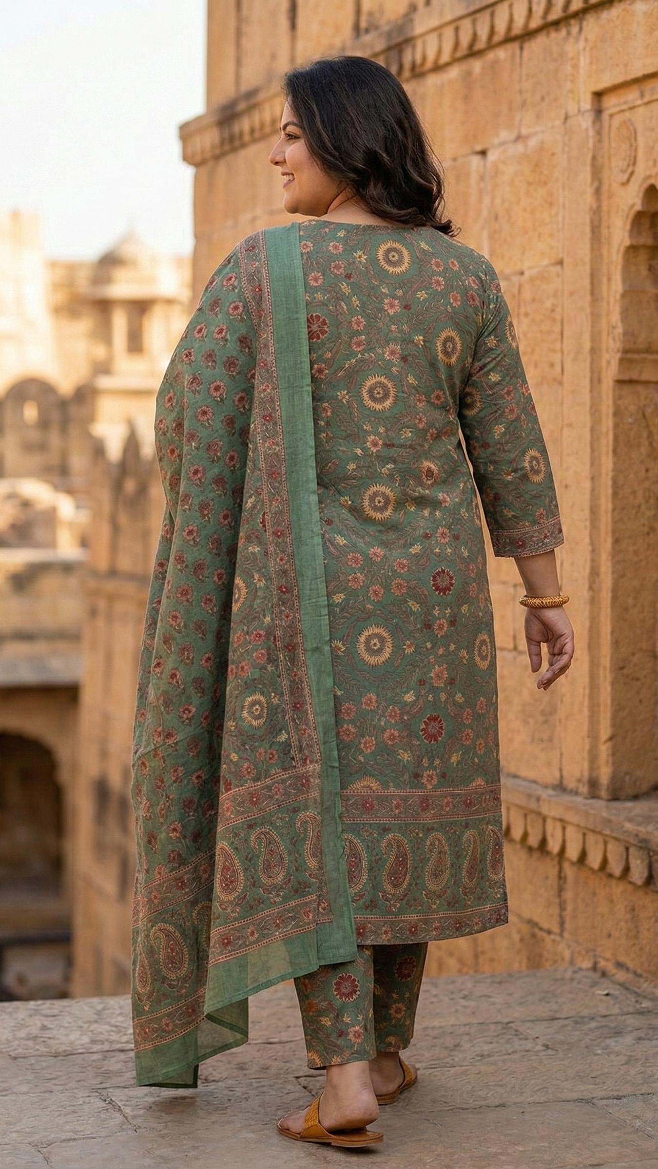 Olive Green Printed Cotton Kurta Set with Dupatta | Elegant 3-Piece Ethnic Suit for Women